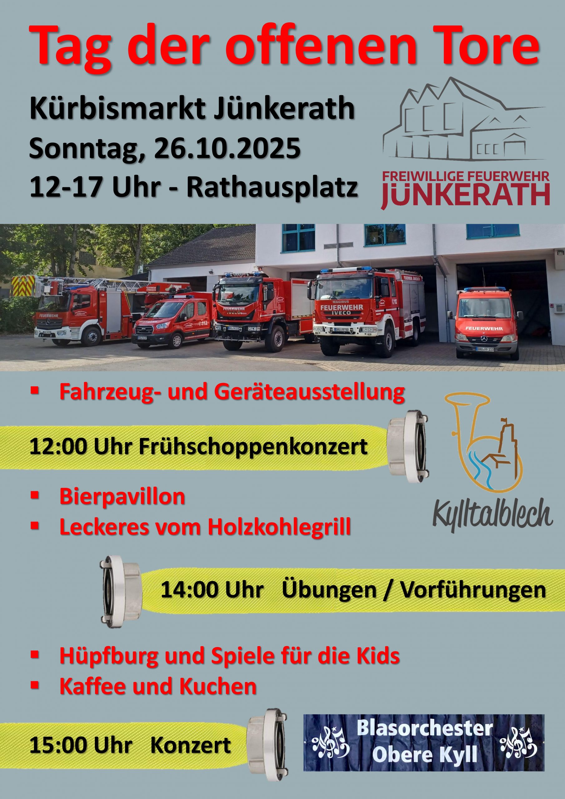 Wir starten um 12.00 Uhr mit einem Frühschoppenkonzert der Kapelle Kylltalblech. Für die Kinder steht eine Hüpfburg bereit. Die Jugendfeuerwehr hat verschiedene Spiele aufgebaut. Die Feuerwehr präsentiert die Fahrzeuge des Löschzugs und die Ausrüstung. Am Nachmittag gegen 15.00 Uhr spielt das Blasorchester Obere Kyll auf.